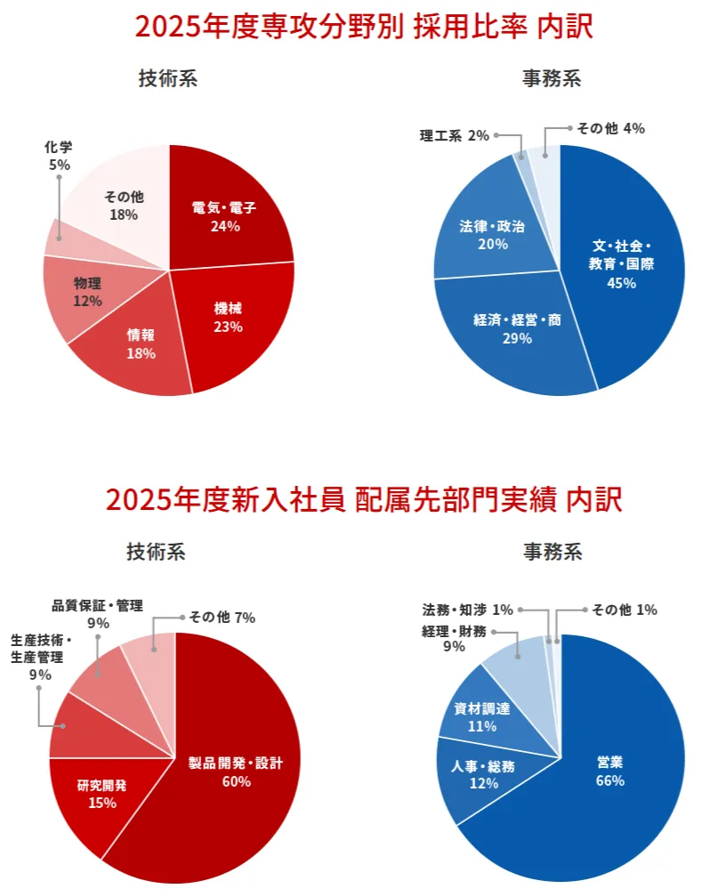 専攻分野別の採用比率と配属先部門の比率は以下の通りです。
