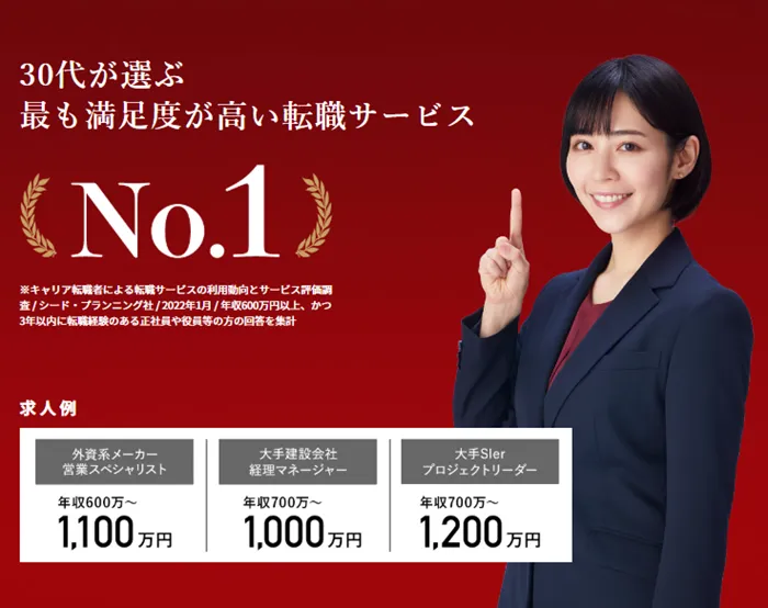独自のネットワークを通じて年収800~2000万円のハイクラス求人を多く扱っており、オリコン満足度調査のハイクラス転職部門で7年連続No.1に選ばれています。